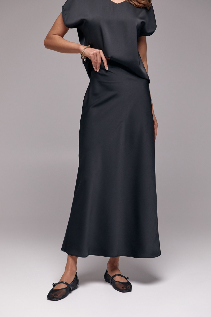 Спідниця прилеглого силуету з шовкової тканини з ніжним блиском. Охайний пояс позаду оздоблений функціональною резинкою.